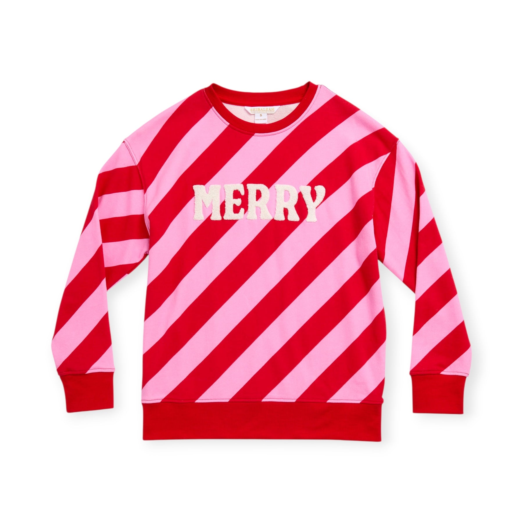 Get into the festive spirit with the Merry Diagonal Striped Classic Sweatshirt! Featuring bold pink and red diagonal stripes and fuzzy ivory lettering, this pullover is holiday cheer in wearable form.