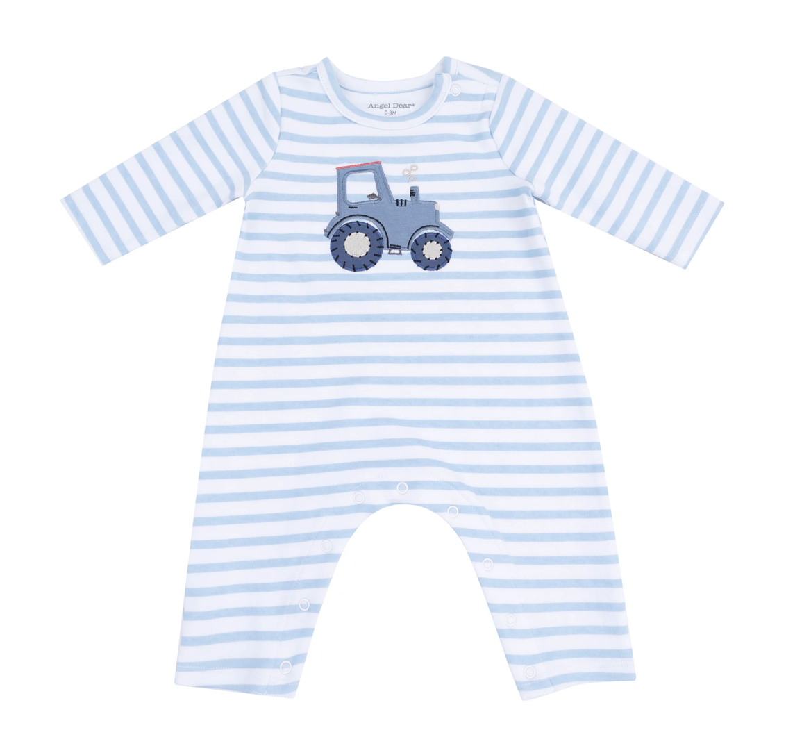 Get ready for cozy days and playful adventures with our Long Sleeve Snap Shoulder Romper, crafted from soft organic cotton jersey. Featuring a charming tractor applique, this romper brings a dash of farmyard fun to your little one’s fall and winter wardrobe.